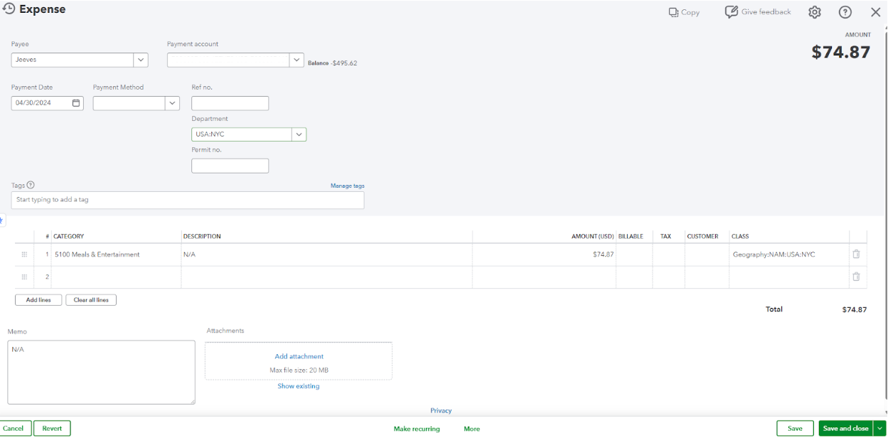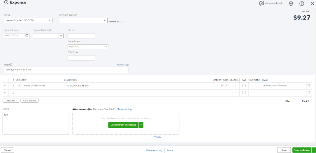 For both expenses and bill payments, once the transactions are synced, an Expense record is created in QBO. The details filled out in the Accounting tab, such as GL Account, Tax Rate, and tracking categories (Class and Location), will be reflected in QuickBooks.