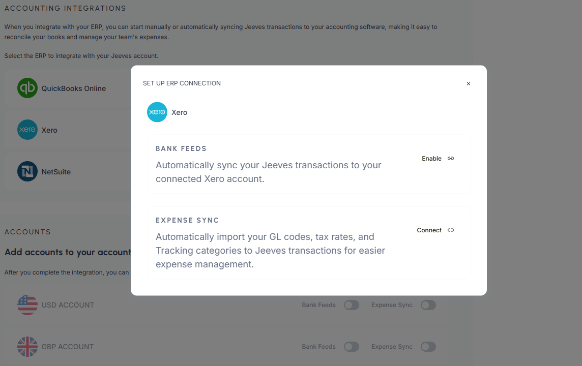 You can now select the Jeeves Cash currency account you want to connect to Xero for usage and reconciliation. Upon enabling Expense Sync for an account, you will be presented with two options for how you’d like to connect and reconcile that account.