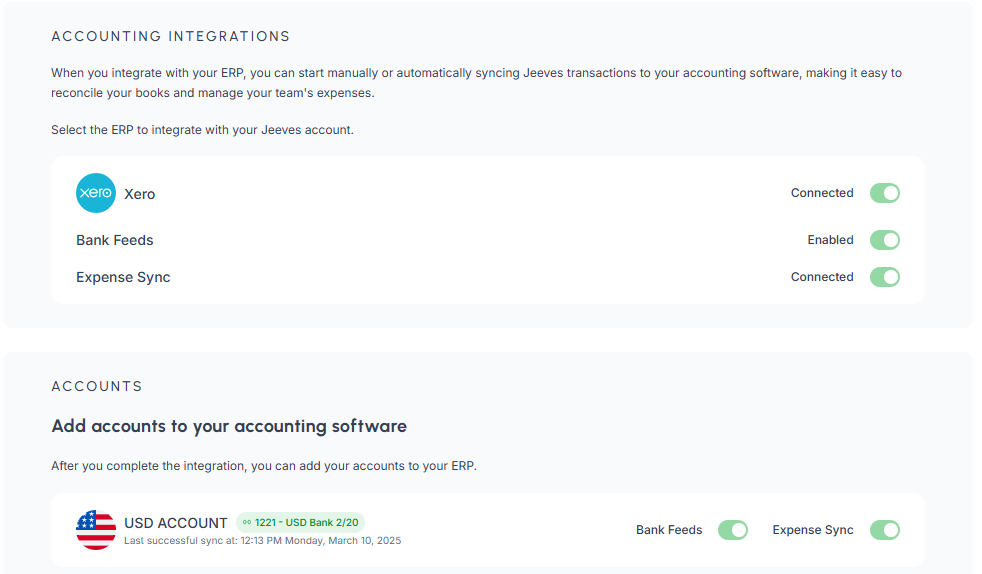 Once connected, select the Jeeves Cash accounts that you would like to sync with your accounting software. This will give you two options: Connect Bank Feed and Connect Expenses. Selecting these will enable that functionality for that bank account.