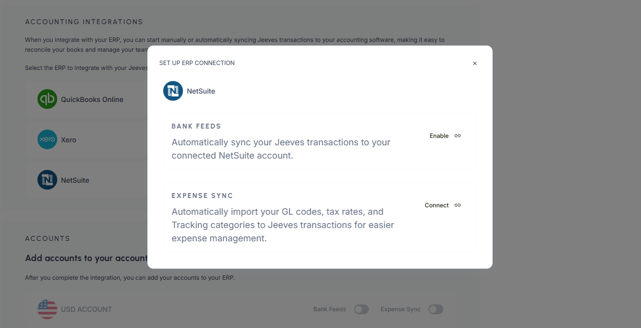 You can now select the Jeeves Cash currency account you want to connect to NetSuite for usage and reconciliation. Upon enabling Expense Sync for an account, you will be presented with two options for how you’d like to connect and reconcile that account.
