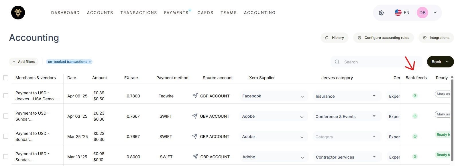The Bank Feed workflow for Xero is an automated sync that updates your Bank Feed every 60 minutes with any transactions made in Jeeves. This happens in the background, so there's no need for manual input or confirmation from you. Bank Feeds allows finance teams to track the flow of funds across various bank accounts, providing a real-time view of cash flow and an accurate figure to reconcile against at the end of the month.
