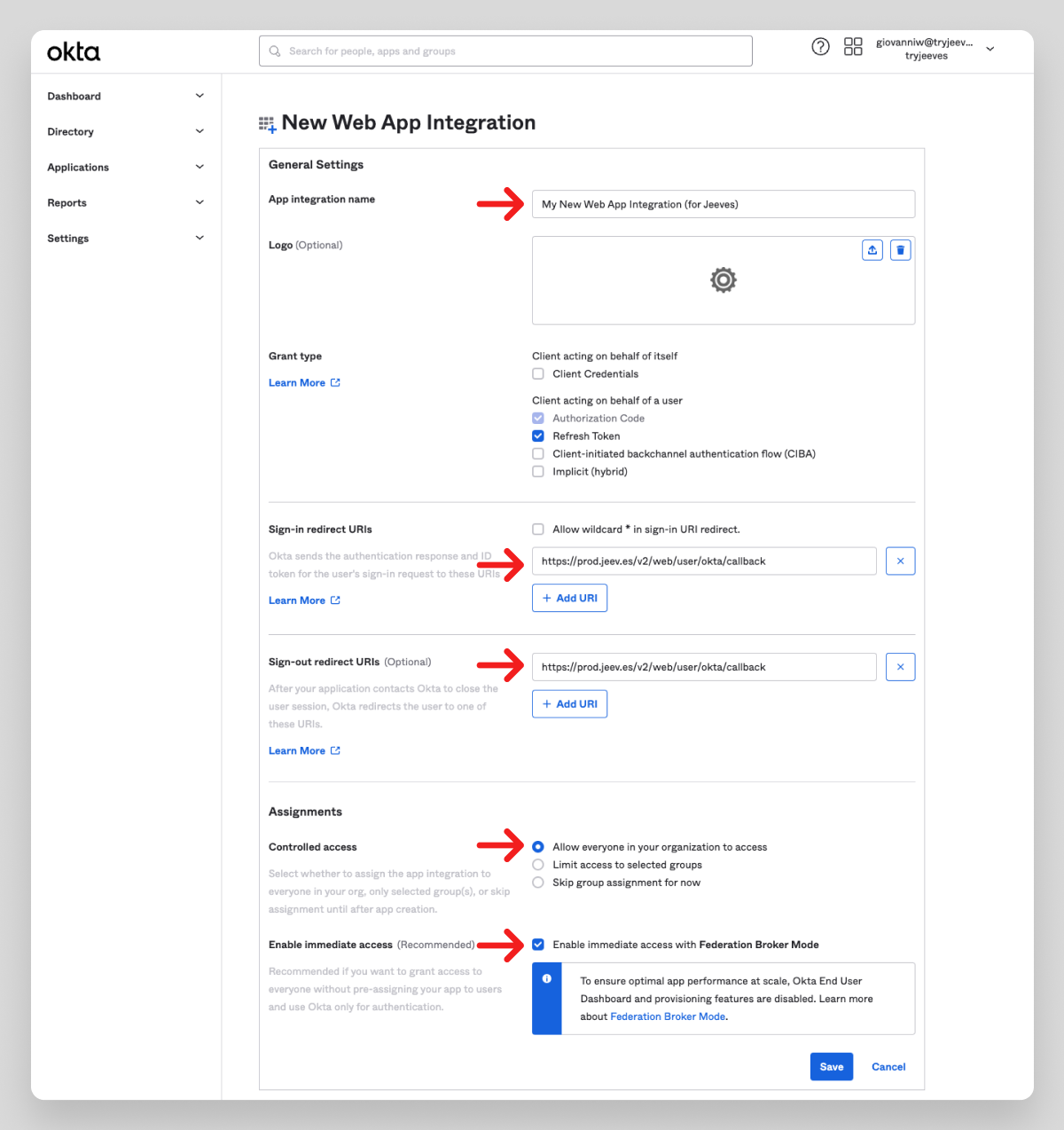 - Copia y pega el siguiente URL en el apartado de Sign-in redirect URls: https://prod.jeev.es/v2/web/user/okta/callback