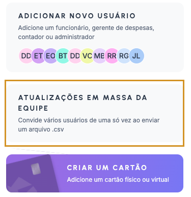 É importante observar que embora o recurso em massa seja excelente para convidar muitos usuários simultaneamente, ele não inclui a opção de atribuir cartões. Se você tiver um sistema HRIS, muitas vezes poderá exportar os dados relevantes e fazer pequenas modificações para garantir que atenda aos nossos requisitos.