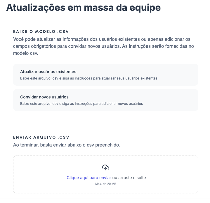Convidar novos usuário: esta opção permite inserir endereços de e-mail, funções, opções de aprovador e locais diretamente no arquivo CSV. Após o upload do arquivo, os usuários convidados serão imediatamente adicionados à plataforma.