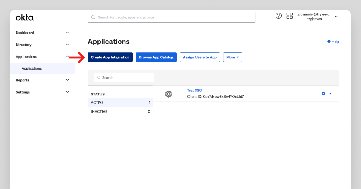 Entre na sua plataforma Okta, navegue até Aplications e clique em Create App Integration: