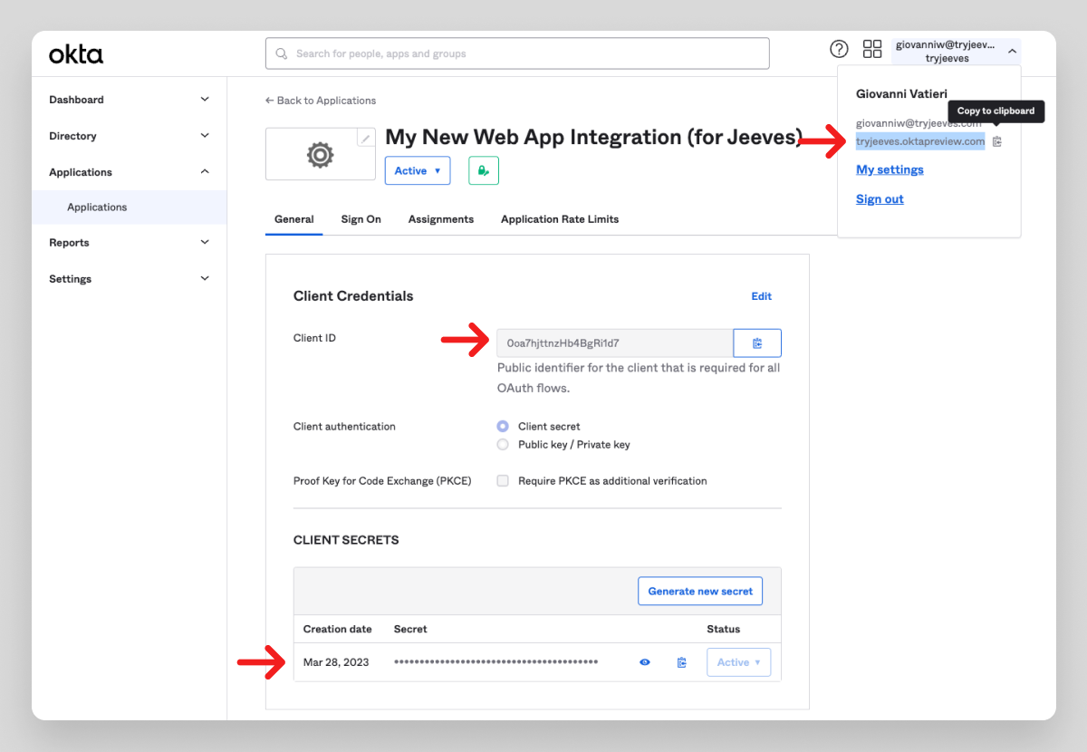 Etapa 3: localize o Client ID, Client Secret e o URL do Okta em seu novo aplicativo Jeeves-Okta